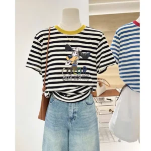 Áo thun nữ Ngắn Tay kẻ Sọc Cotton phối viền màu Menina_studio, áo thun sọc ngắn tay in hình form rộng